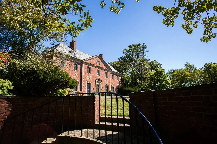The back lawn of the Peterloon estate is surrounded by a breathtaking view of the stunning property and has an expansive 55’x100’ hardscape terrace fashioned with attractive pavers that blends seamlessly with the historic appearance of the estate, complete with a walkway leading from the house and an adjacent catering space.